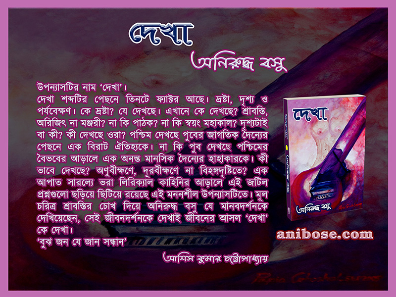 অনিরুদ্ধর এই উপন্যাসটির নাম ‘দেখা’। ছোট্ট নাম, কিন্তু তাৎপর্য গভীর। দেখা শব্দটির পেছনে তিনটি ফ্যাকটর আছে। দ্রষ্টা, দৃশ্য এবং পর্যবেক্ষণ। কে দ্রষ্টা? যে দেখছে। এখানে কে দেখছে? শ্রাবস্তি, অরিজিৎ না মঞ্জরী? নাকি পাঠক? নাকি মহাকাল? দৃশ্যটাই বা কী? কী দেখছে ওরা? পশ্চিম দেখছে পুবের জাগতিক দৈন্যের পিছনের এক বিশাল বিরাট ঐতিহ্যকে। নাকি পুব দেখছে পশ্চিমের বৈভবের আড়ালের এক অনন্ত দৈন্যের হাহাকারকে? কী ভাবে দেখছে? অণুবীক্ষণে না দূরবীক্ষণে? নাকি বিহঙ্গদৃষ্টিতে?