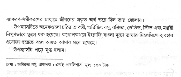 অনিরুদ্ধ এক আপাত সরল কাহিনির মধ্যে দিয়ে চিন্তাশীল পাঠককে জীবন সম্পর্কিত অনেকগুলি মৌলিক প্রশ্নর মুখোমুখি দাঁড় করিয়ে দিয়েছে, এটাই এক সংবেদনশীল লেখক হিসেবে ওর কৃতিত্ব।