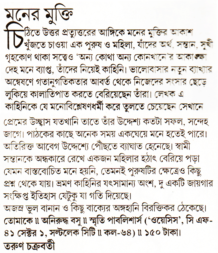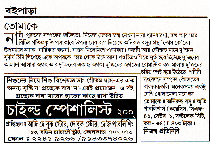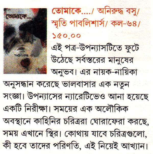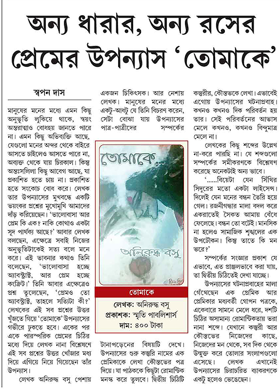 তোমাকে বইটা অনেক পরিণত, হয়ত বিষয়টা কিছুটা অ্যাডাল্ট।  প্রথম পাঠে মনে হতে পারে বুদ্ধদেব বসুর ‘রাত ভোর বৃষ্টির’ মতো লাগবে। কিন্তু কাহিনি কিছুটা অগ্রসর হলেই বোধটা বদলে যায়। পরকীয়া সম্পর্ক decriminalized হওয়ার পরে এই গল্পের গুরুত্ব অনেক বর্ধিত। দুজন পরিণত বয়স্ক মানুষ, নারী ও পুরুষ, দুজনেই বিবাহিত, দুজনেরই সংসার আছে। ঘোর সংসারী। তা সত্যেও তারা আকৃষ্ট হয় একে অপরের প্রতি।  গল্প বলা পত্র মাধ্যমে, দু’জনের স্বীকারোক্তি – সেখানে ঠিক-ভুল, নৈতিক-অনৈতিক নিয়ে টানাপড়েন নেই। ঘটনার আকস্মিকতায়, মুহূর্তের মাহাত্ম্য, অপরের জীবনে ব্যাঘাত না হেনে দুটি মানুষের প্রেম এবং যেভাবে এই দুই ব্যক্তি তাদের ভালবাসায় শ্রদ্ধাশীল, বাংলা উপন্যাসে বিরল। Monogamy র myth কে লেখক যেভাবে ভেঙেছেন তার জন্য সাহস লাগে। অভিনন্দন অনিরুদ্ধ বাবুকে এত বলিষ্ঠ, controversial বিষয় উপন্যাসের subject বাছার জন্য।