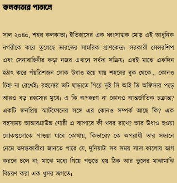 1. Nicely plotting the whole story with a vision of what can happen after 40 years in our life. Actually 40 years is neither a very long tenure, nor very short. So it is very tough to visualise how much progress can happen... jemon dhoro, tumi jadi ei story ta 200 yrs porer backdrop e korte tahole u can write anything in science fiction coz nobody knows wats going to happen- bt after 40 years emon kichu likhte hobe jar sathe reality r atleast 40-50 % mil ache n progress can be like dat- kudos to you je tumi darun ekta kolkata after 40 years design korecho- hya, 40 years por ei guloi amader life e ashbe jemon on-board computer, GPS locking, tracking thru server n all- awesome.